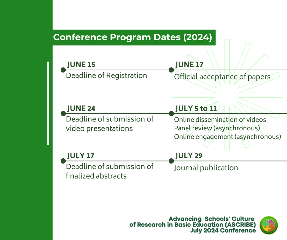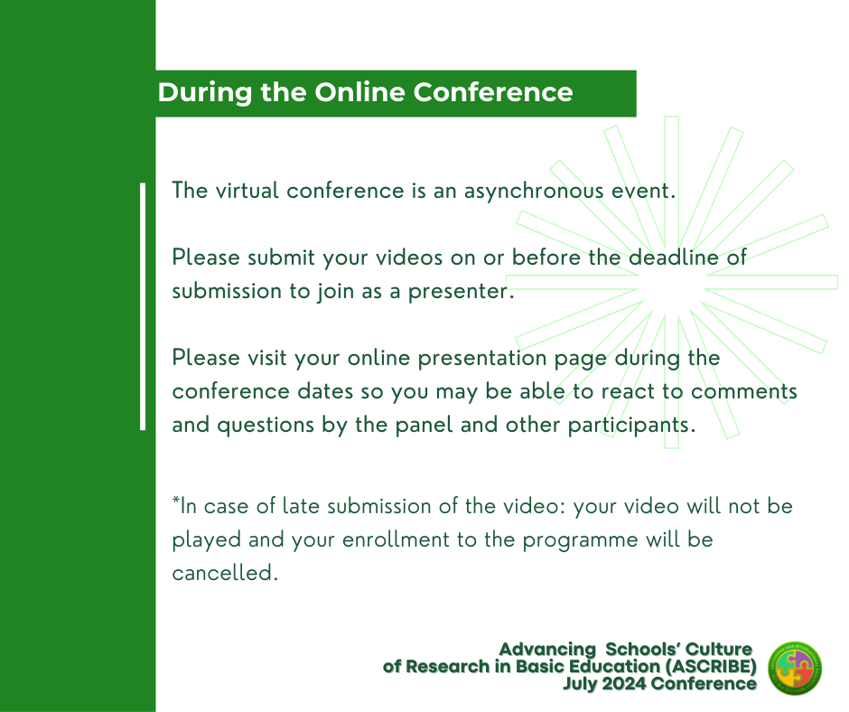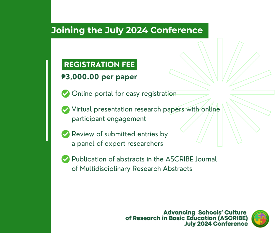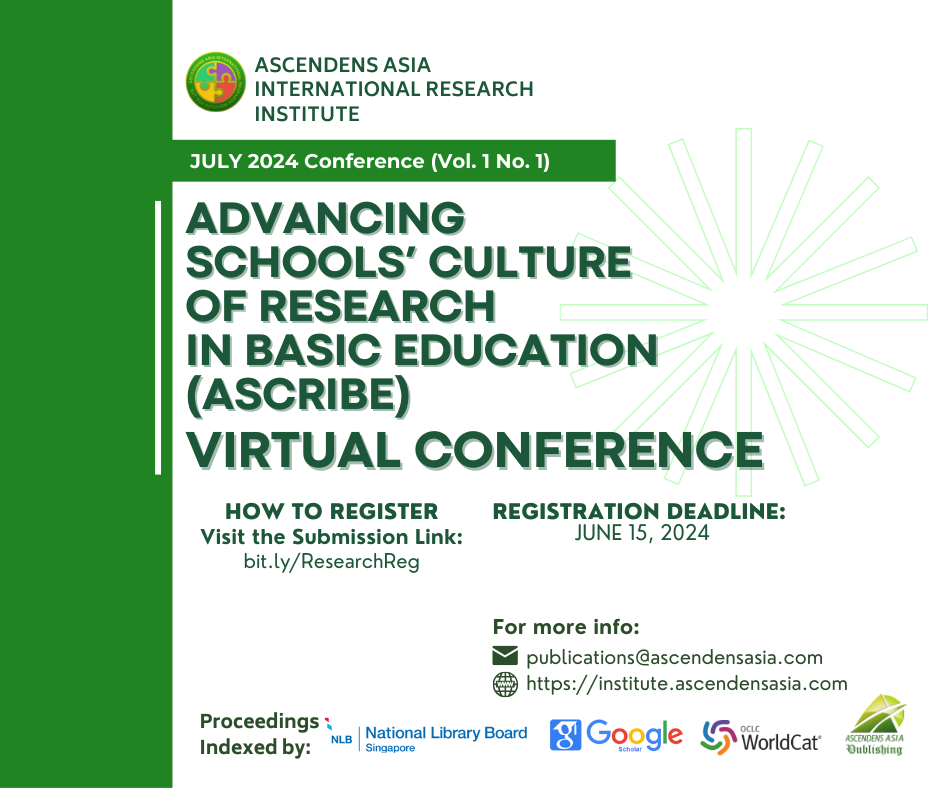The ASCRIBE Virtual Program mainly focuses on research improvement and dissemination by hosting pre-recorded video presentations on the AAIRI website and international journal publications of accepted research indexed in WorldCat, Google Scholar, the National Library Board of Singapore, and the Open Journal System of Ascendens Asia Publishing. Through this, other researchers and interested parties can freely engage with researchers to develop an environment of continuous learning.