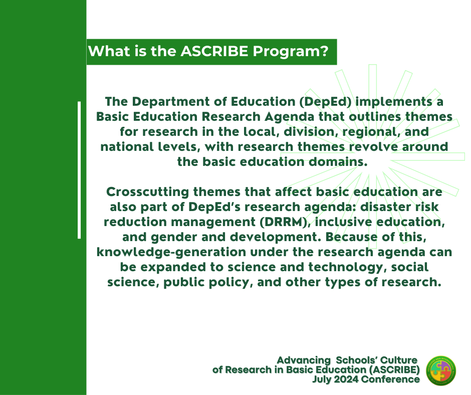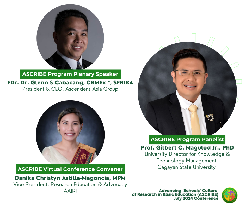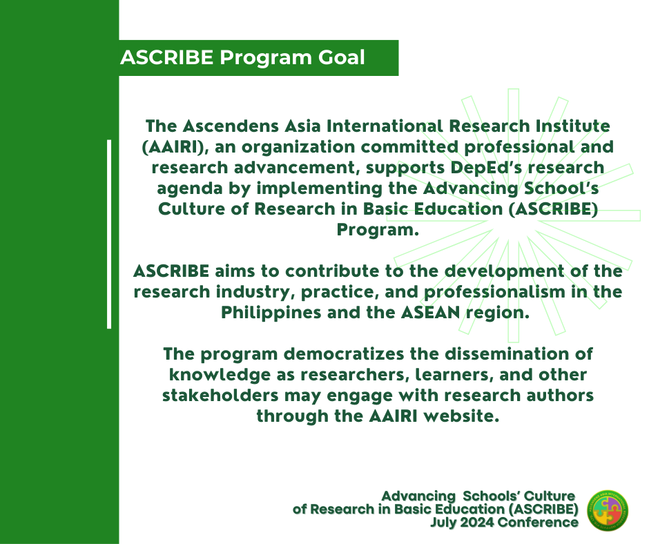 ASCRIBE Virtual aims to contribute to developing the research industry, practice, and professionalism in the Philippines and the ASEAN region. The program includes engaging reputable professional organizations and academic institutions in their pursuit of propagating research as an advocacy for community empowerment and facilitating a learning environment for Filipino researchers. More importantly, the program democratizes the dissemination of knowledge as researchers, learners, and other stakeholders may engage with research authors through the AAIRI website.