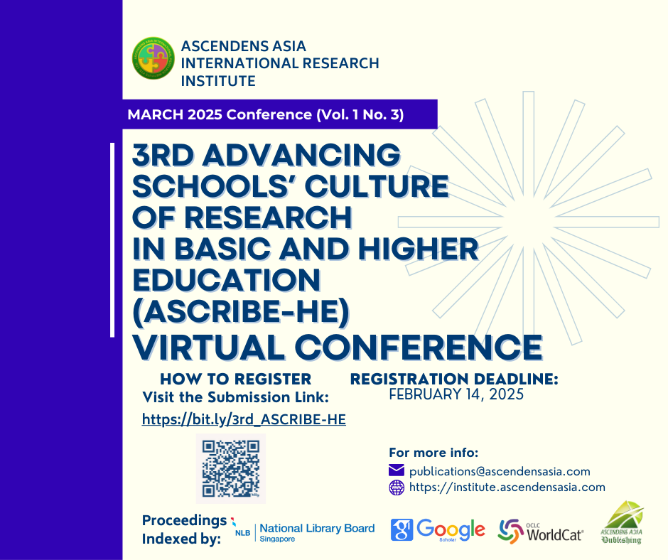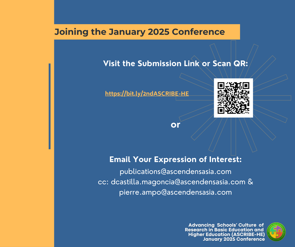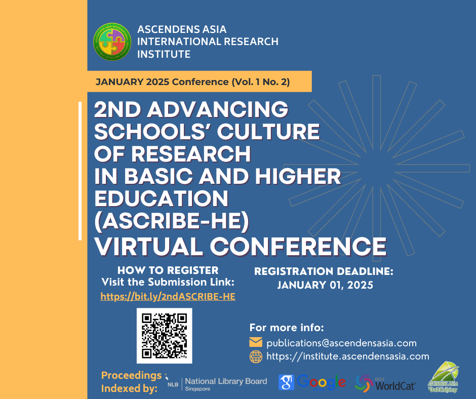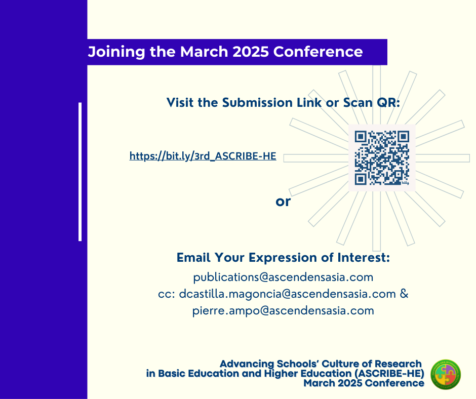 The ASCRIBE Virtual Program mainly focuses on research improvement and dissemination by hosting pre-recorded video presentations on the AAIRI website and international journal publications of accepted research indexed in WorldCat, Google Scholar, the National Library Board of Singapore, and the Open Journal System of Ascendens Asia Publishing. Through this, other researchers and interested parties can freely engage with researchers to develop an environment of continuous learning.