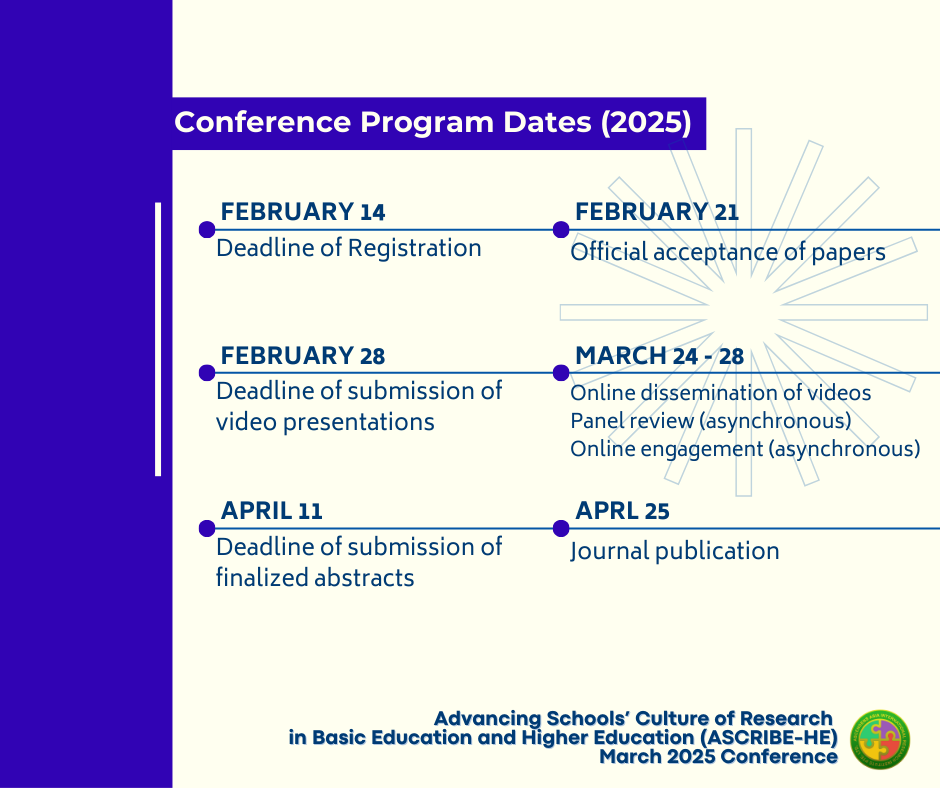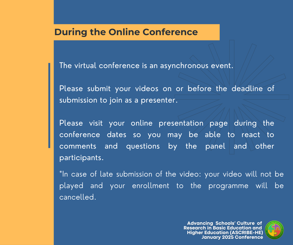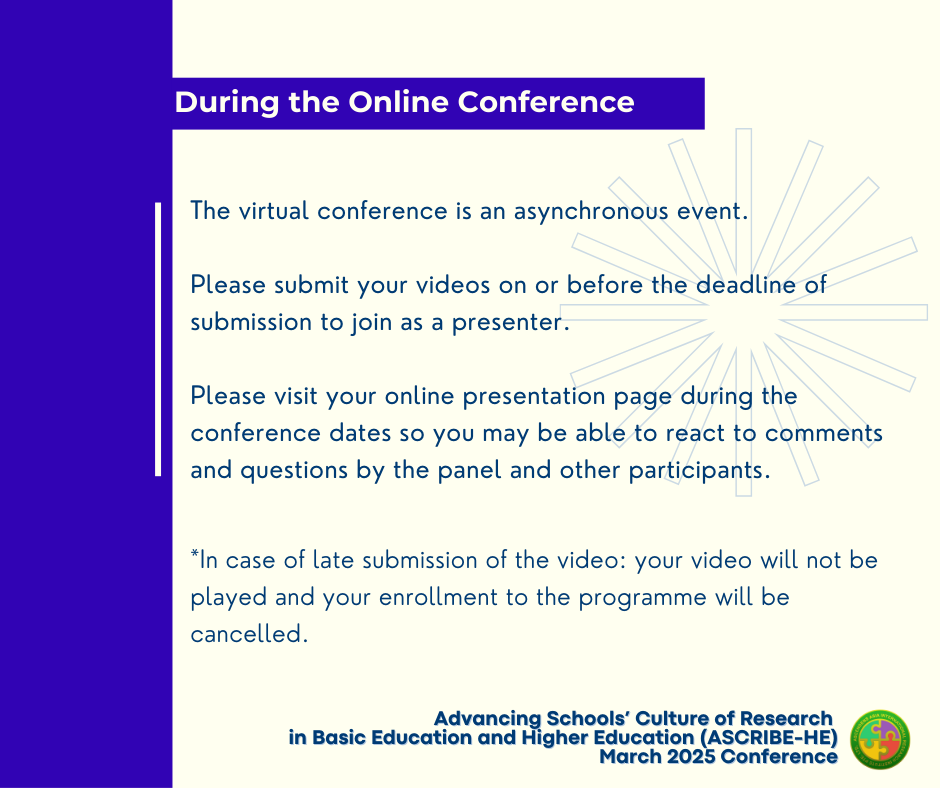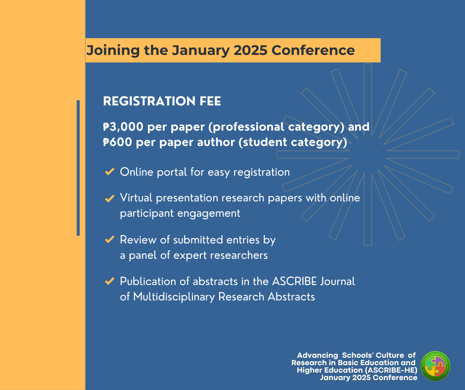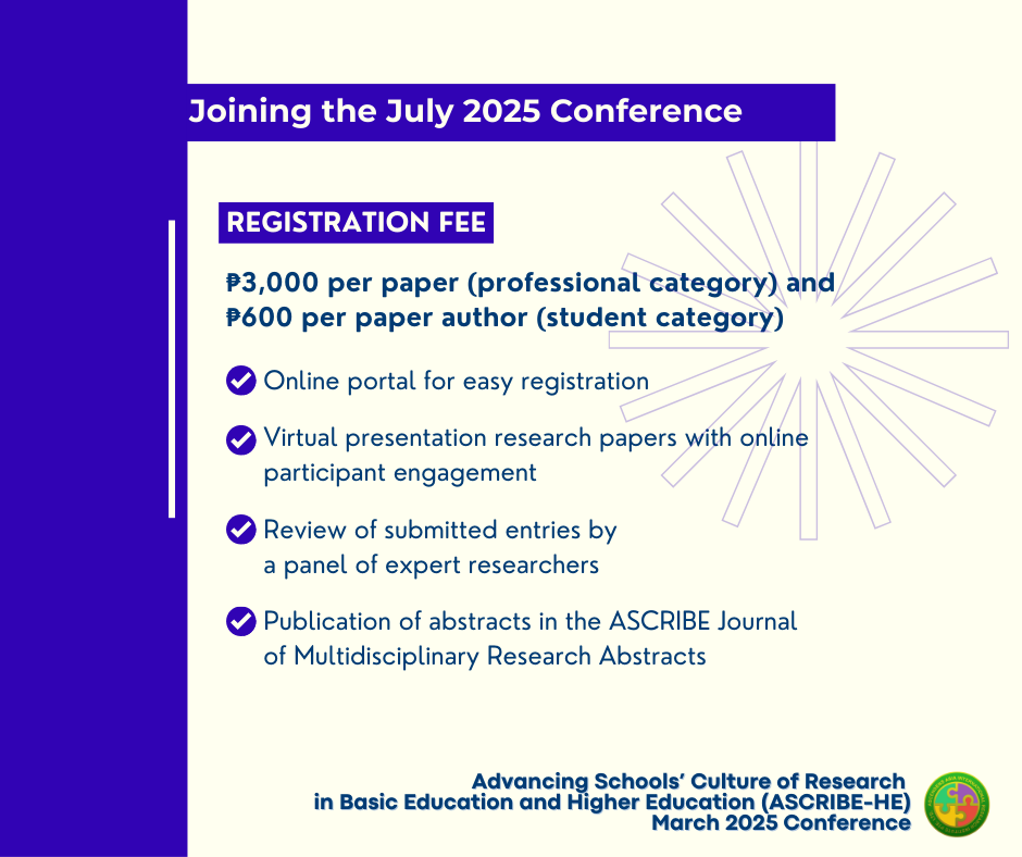 The ASCRIBE Virtual Program mainly focuses on research improvement and dissemination by hosting pre-recorded video presentations on the AAIRI website and international journal publications of accepted research indexed in WorldCat, Google Scholar, the National Library Board of Singapore, and the Open Journal System of Ascendens Asia Publishing. Through this, other researchers and interested parties can freely engage with researchers to develop an environment of continuous learning.