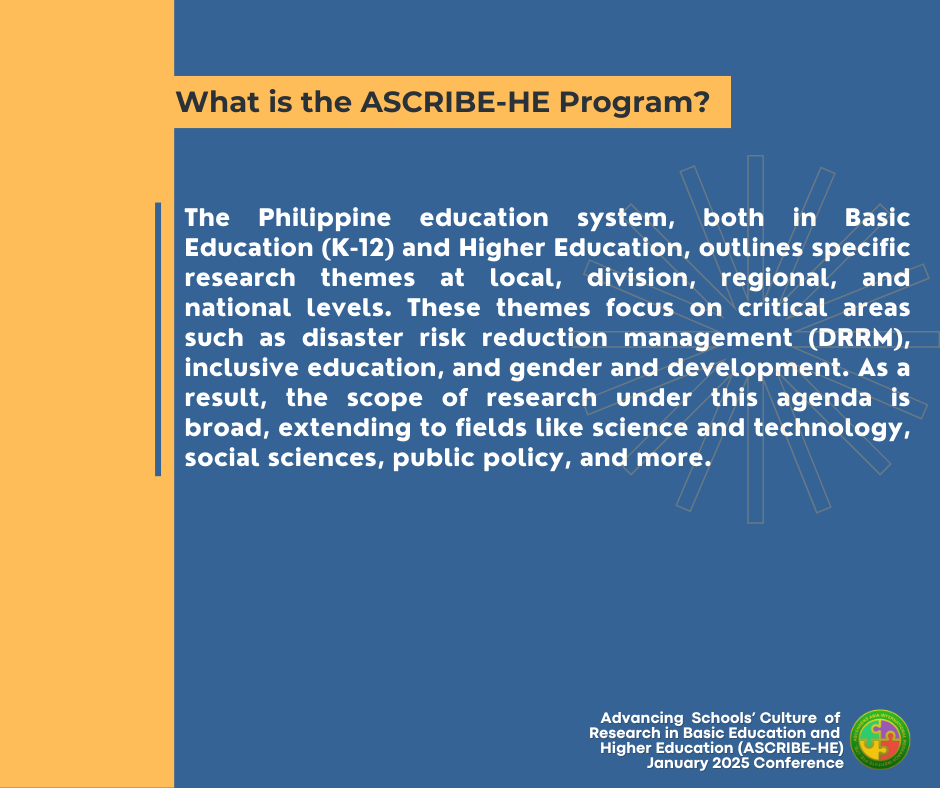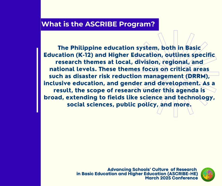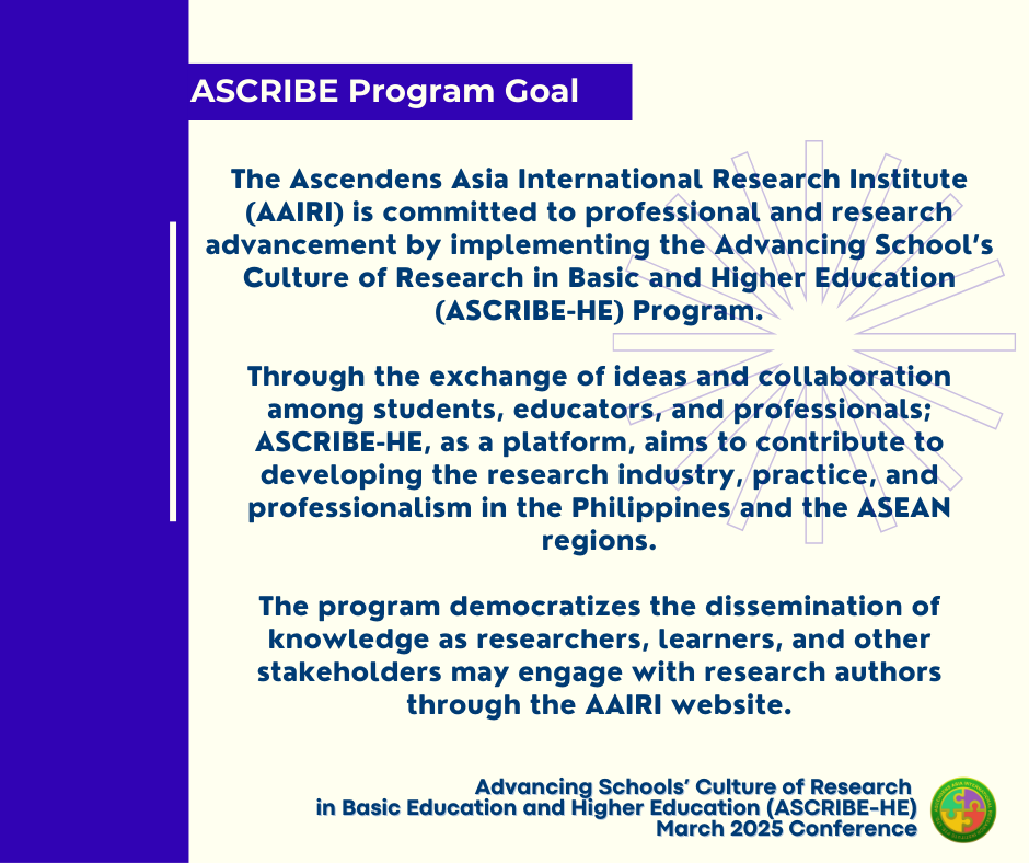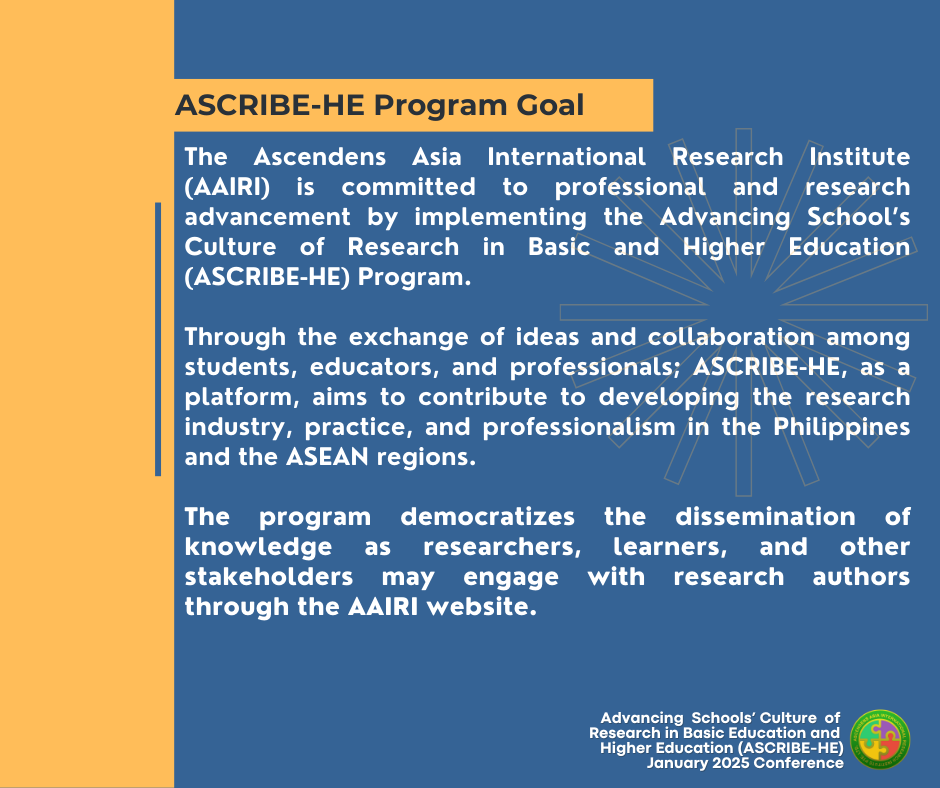 ASCRIBE-HE Virtual aims to contribute to developing the research industry, practice, and professionalism in the Philippines and the ASEAN region. The program includes engaging reputable professional organizations and academic institutions in their pursuit of propagating research as an advocacy for community empowerment and facilitating a learning environment for Filipino researchers. More importantly, the program democratizes the dissemination of knowledge as researchers, learners, and other stakeholders may engage with research authors through the AAIRI website.